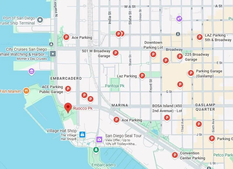 Parking for the ride is located in any public parking lot/garage or legal street parking in the surrounding area near Ruocco park – Seaport Village - 600 N. Harbor Dr. Many of the metered parking spaces in San Diego are now enforced 7 days a week and are only available for 2 Hour blocks. Please check signs and meters if you park on the street. Please arrive early.